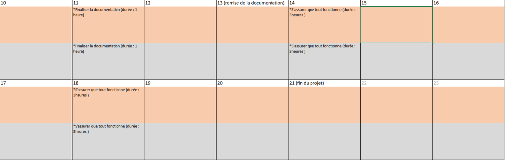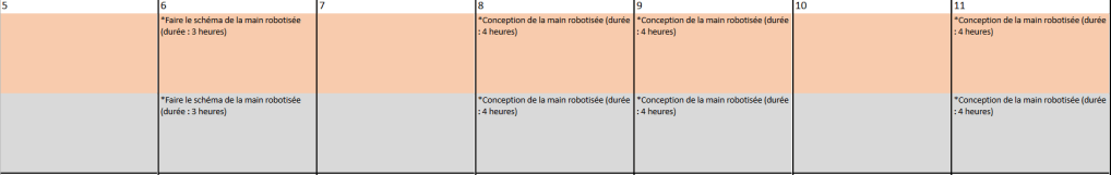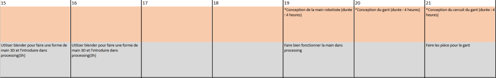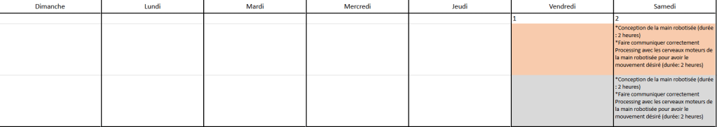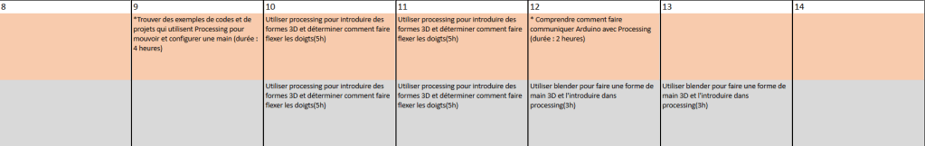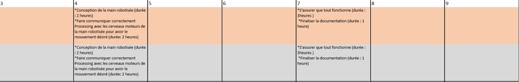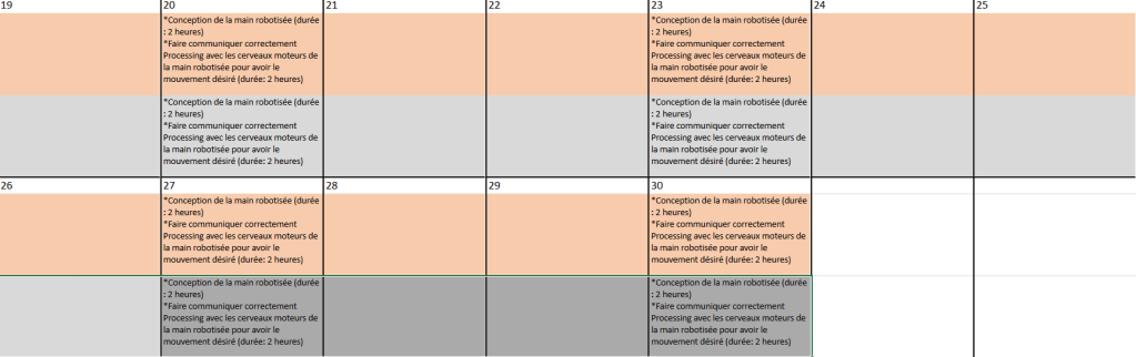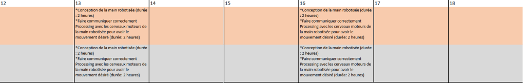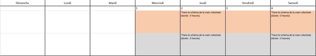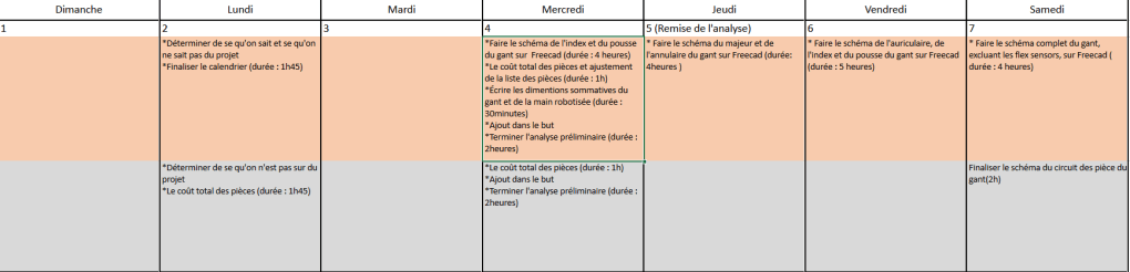 Lundi (2 mars 2020), j’ai refait, à l’aide de la répartition des tâches que moi et mon coéquipier avion discuté, le calendrier et je l’ai finaliser. Puis, durant le cours, j’ai aidé un peu mon coéquipier à écrire dans la faisabilité du projet. Cependant, cela a pris plus de temps que prévu, ce qui m’a empêché de déterminer les dimensions sommatives du gant et de la main robotisée. Ensuite, nous n’avons pas réussi à finaliser l’analyse préliminaire, car le coût total des pièces n’était pas terminer, les dimensions du gant et de la main robotisée n’était pas déterminées et notre but n’était pas assez précis. Donc, j’ai déplacé dans le calendrier les tâches inachevées vers mercredi (4 mars 2020).