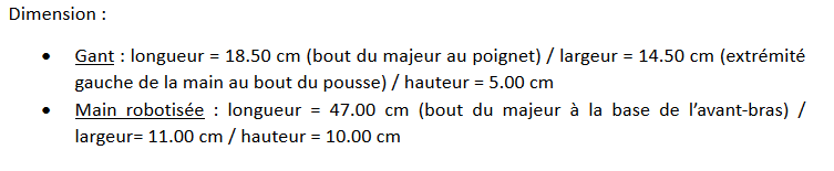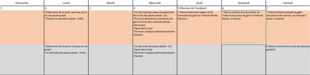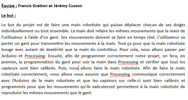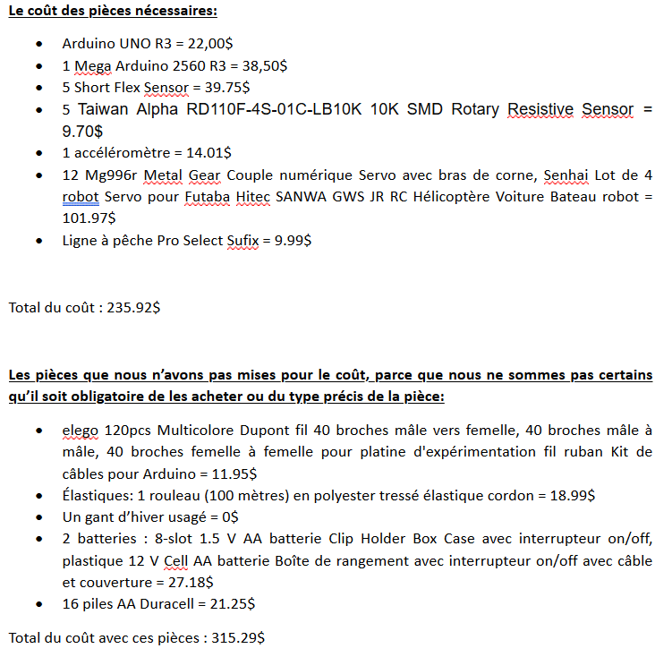 Dans l’analyse préliminaire, pour la liste des coûts, j’ai repris là où mon coéquipier s’était arrêté. Puis, j’ai finaliser la liste des coûts en rajoutant les pièces manquantes, ce qui m’a permis de calcul un coût total de 235,92$ sans les pièces dont on n’est pas sûr et de 315,29$ avec les pièces dont on n’est pas sûr. Pour être plus précis, les pièces que j’ai rajouté pour faire le coût total avec et sans les pièces dont on n’est pas sûr sont l’elego 120pcs Multicolore Dupont fil 40 broches mâle vers femelle, 40 broches mâle à mâle, 40 broches femelle à femelle pour platine d’expérimentation fil ruban Kit de câbles pour Arduino, l’élastique, les deux batteries, 16 piles AA Duracell et la ligne à pêche Pro Select Sufix. Ensuite, j’ai aussi rajouter dans la liste des pièces pour le gant une batterie (8-slot 1.5 V AA batterie Clip Holder Box Case avec interrupteur on/off, plastique 12 V Cell AA batterie Boîte de rangement avec interrupteur on/off avec câble et couverture) et 8 piles AA Duracell. Puis, pour la liste de la main robotisée, j’ai rajouté un élastiques pour tirer les doigts vers l’arrière (1 rouleau (100 mètres) en polyester tressé élastique cordon), une batterie (8-slot 1.5 V AA batterie Clip Holder Box Case avec interrupteur on/off, plastique 12 V Cell AA batterie Boîte de rangement avec interrupteur on/off avec câble et couverture) et 8 piles AA Duracell. Ensuite, j’ai rajouté les dimensions sommaires du gant, calculs effectué à partir des dimensions de ma main, et de la main robotisée, calculs effectués à l’aide des dimensions des cerveaux moteurs (MG996R) et à partir des dimensions de mon bras. Pour terminer, j’ai écrit dans le but, pour qu’il soit plus précis, la chose suivante : << […] vérifier que tous les capteurs sont bien calibrés. Puis, nous allons faire la main robotisée. Afin de faire la main robotisée correctement, nous allons nous assurer que Processing communique correctement avec l’Arduino de la main robotisée et que les capteurs sur celle-ci sont bien calibrés et programmés pour que les mouvements qu’ils exécuteront permettent à la main robotisée de reproduire les mêmes mouvements que le gant. >>