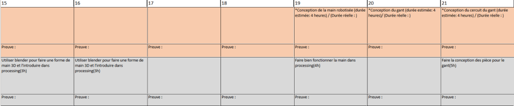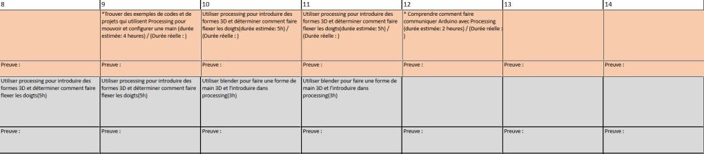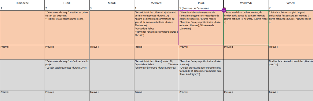 Nous avons continué à faire l’analyse préliminaire. Plus précisément, nous avons peaufiné le but de notre projet en rajoutant du texte et des images. Puis, j’ai modifié le coût en faisant les calculs dans des tableaux pour être plus clair. Pour finir, nous avons rajouté des descriptions dans la faisabilité du projet. Cependant, j’avais prévu de terminer l’analyse préliminaire en 1 heure, mais, à cause des ajouts dans la description et de la modification de l’analyse préliminaire et des modifications du calendrier, cela nous a pris 2 heures et 40 minutes.