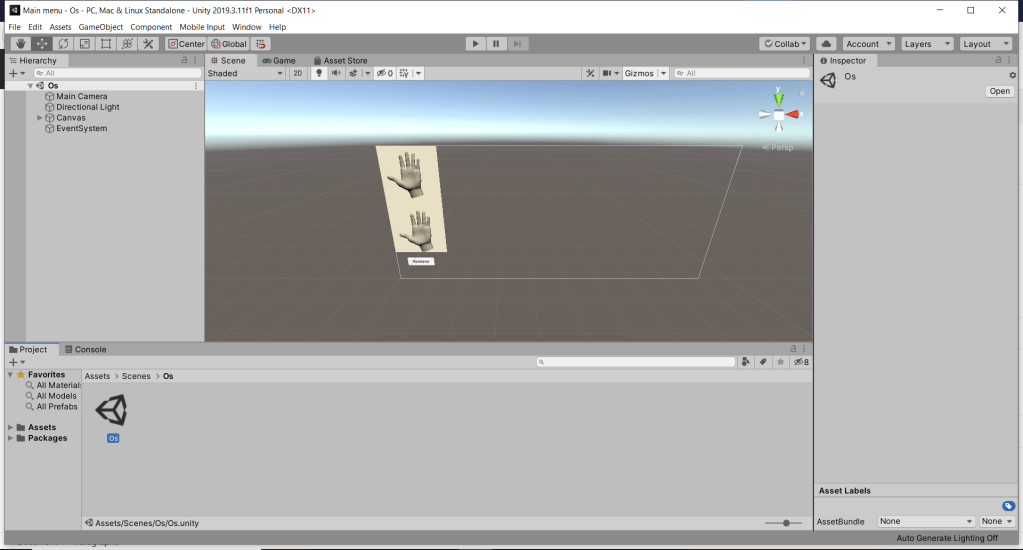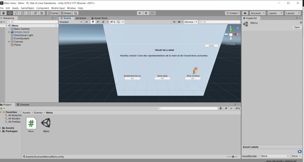 Aujourd’hui, j’ai fais le menu de notre programme de la main. En même temps, je me suis réhabitué à utiliser C#. Puis, j’ai commencer à faire la scène pour la main seulement avec les os, mais je ne l’ai pas fini.