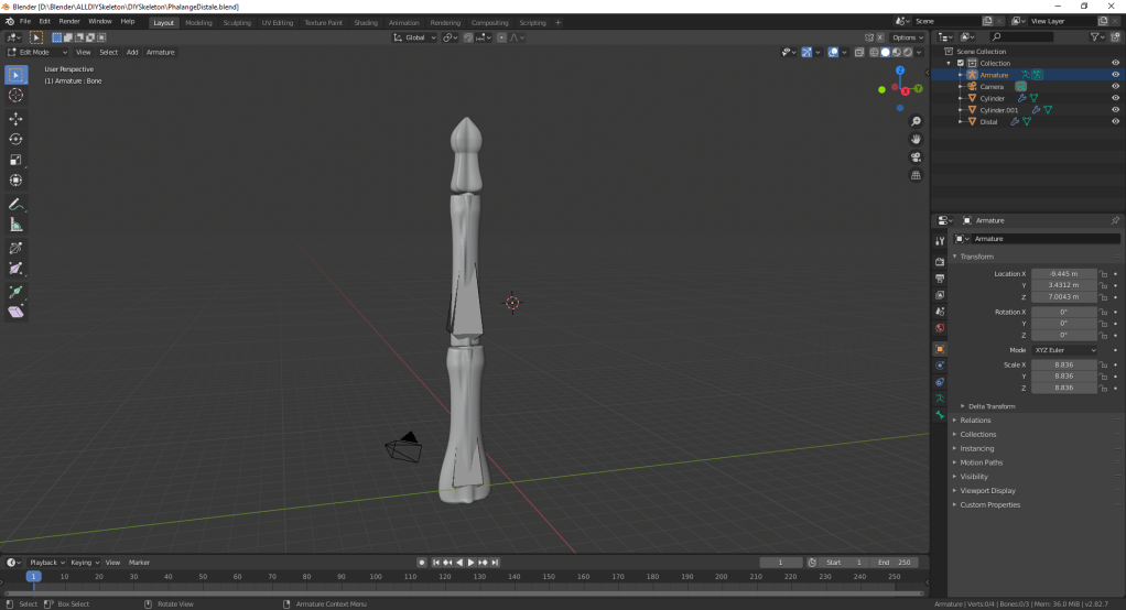 (2020-04-26): J’ai commencer à faire une main en squelette. Ma pratique à faire le marteau se mettait à l’épreuve. Évidement je ne connaissais pas tout, alors j’ai commencer par la forme générale de la phalange distale. En faisant cette forme je commençait à être de plus en plus familier avec les touche que je connaissais déjà avec mon tutoriel. Quand je me posais des question sur une certaine chose, pour savoir comment faire, je cherchais sur Google pour trouver la réponse. Avec plusieurs essaie j’ai réussi à faire une phalange distale qui ressemblait quand même bien à ça. Ensuite, j’ai fais la phalange moyenne et la phalange proximale. J’ai ensuite ajouter des os ou aussi appelé armature pour faire les mouvement d’un doigt.
