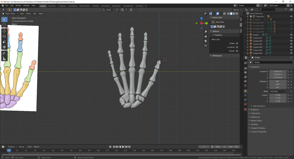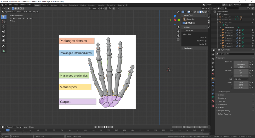 (2020-05-04): Je me suis lancé au os des Carpes, les os du poignet. J’ai découvert une méthode qui m’a permis de suivre la forme 2D de l’image et ensuite la faire 3D. Ça consiste faire le dessin de la forme que tu veux avec un Plane et ensuite extrude le plane pour qu’il soit maintenant 3D. Ensuite, il manque quelques ajustement pour qu’il soit plus réaliste et la pièce d’un os était fait. Bien sur, chaque os est différent alors je devais refaire la même technique à chaque os nouveau que j’avais.