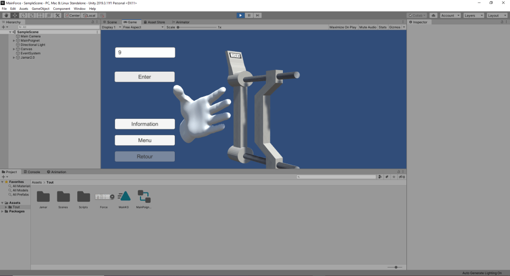 (2020-05-14) et (2020-05-15): J’ai fait la scène de force sur Unity. J’ai commencer par faire un << Jamar grip strength >> en Blender. Je l’ai mis dans ma scène pour ensuite faire apparaitre un chiffre sur l’endroit qui dit la force que tu appliques.