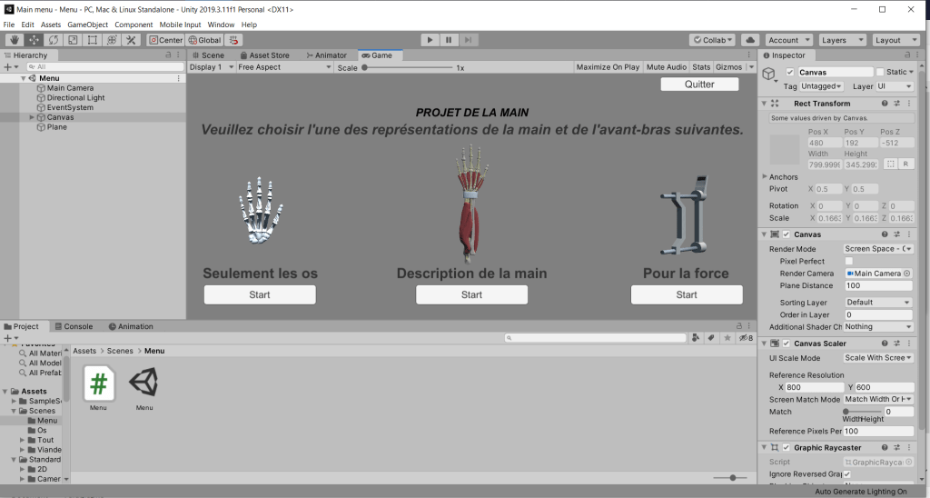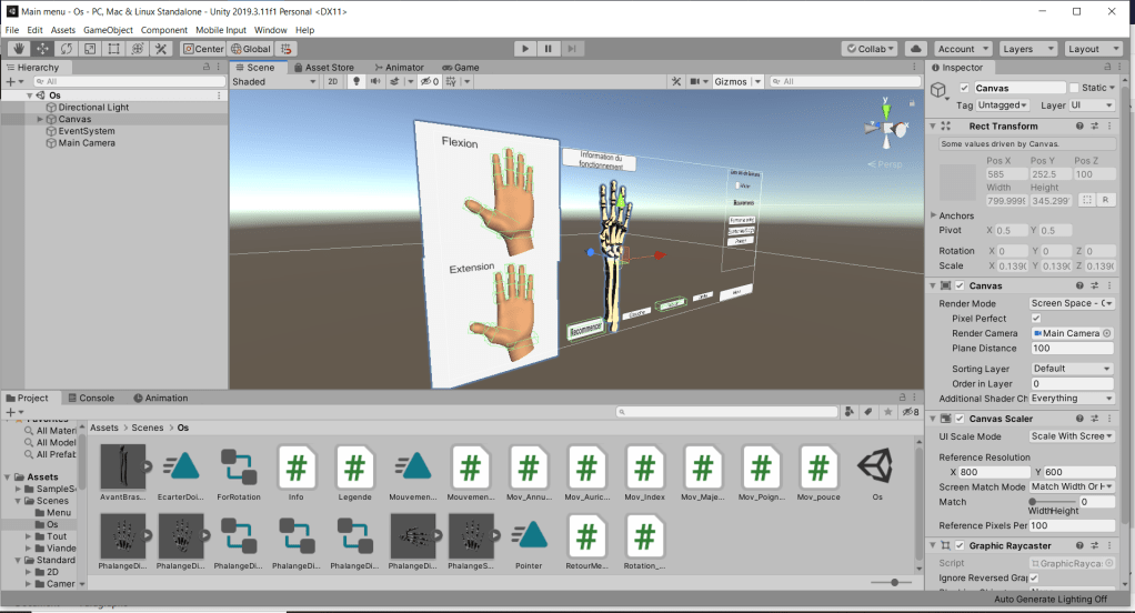 14 mai 2020, j’ai encore modifié la scène Os pour que, lorsque l’application est en mode plein écran, la main flexion, la main extension, la main et l’avant-bras en os arrêtent de grossir et de déborder de l’écran, ce qui désalignait tout mes objets. Pour ça, j’ai rapetissé mes objets et je les ai mis dans mon Canvas.