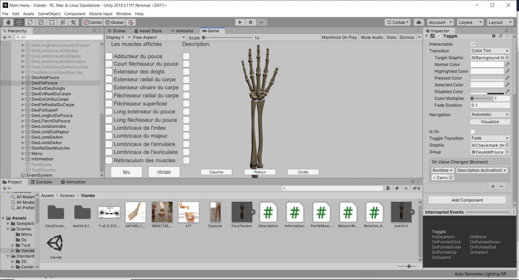 14 mai 2020, j’ai commencer à faire ma scène Viande où il sera question de l’affichage et de la description des muscles et de certains tendons de la main et de l’avant-bras. J’ai réussi, une fois que me coéquipier m’a envoyé la main et l’avant-bras en chair, à placer dans mon Canvas 14 Toggle pour les muscles et les tendons que nous voulions faire apparaitre. Ensuite, j’ai fait en sorte que lorsque que l’utilisateur clique sur l’un des Toggle de l’affichage, la partie rattaché à celui-ci apparait.